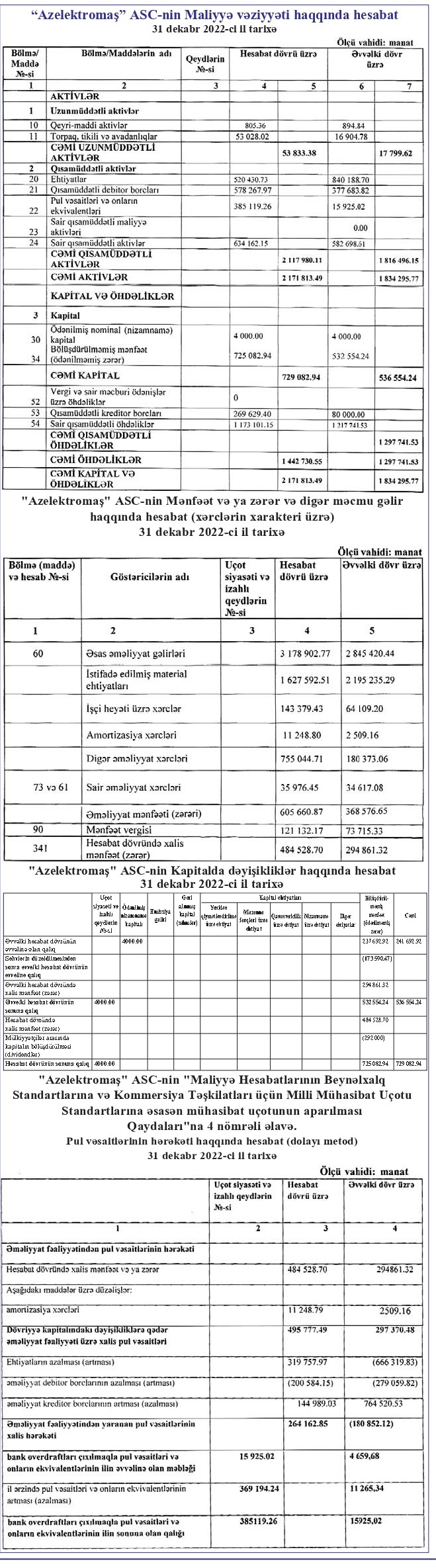 "Azelektromaş" ASC 2022-ci ili 485 min manat xalis mənfəə ilə başa vurub. Şirkət 2021-ci ili 295 min manat xalis mənfəət ilə bağlamışdı. Beləliklə, "Azelektromaş"ın xalis mənfəəti 64,4% artıb.
