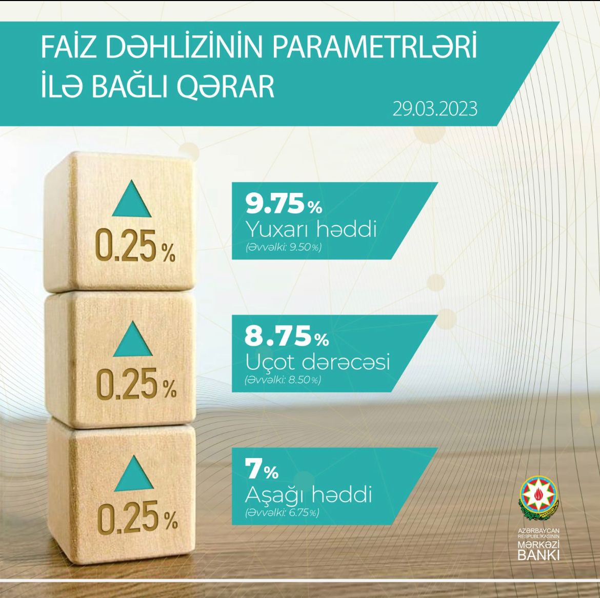 Xatırladaq ki, 01 fevral 2023-cü il tarixində Azərbaycan Respublikası Mərkəzi Bankının İdarə Heyətinin qərarı ilə uçot dərəcəsi 0.25 faiz bəndi artırılaraq 8.5%-ə, faiz dəhlizinin aşağı həddi 0.5 faiz bəndi artırılaraq 6.75%-ə, faiz dəhlizinin yuxarı həddi isə 0.25 faiz bəndi artırılaraq 9.5%-ə qaldırılmışdı.