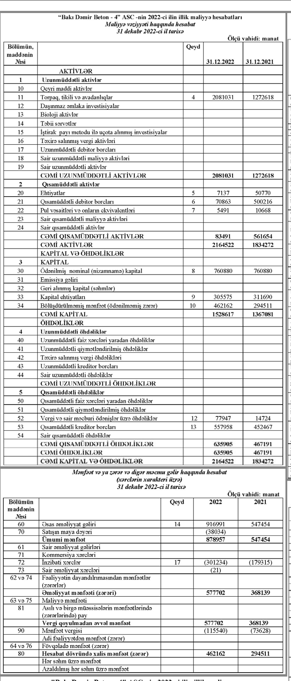 "Bakı Dəmir Beton - 4" ASC 2022-ci ili 462 min manat xalis mənfəət ilə başa vurub. Şirkət 2021-ci ili 294 min manat xalis mənfəət ilə bağlamışdı.
