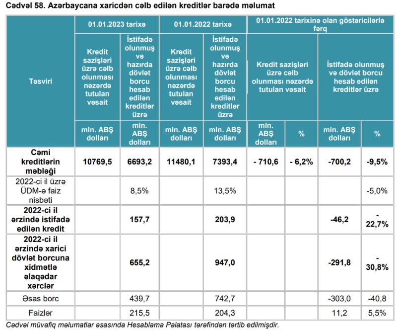 "Hesabat ilində yerləşdirilmiş istiqrazlar hesabına dövlət büdcəsinə daxil olmuş vəsaitin 592 milyon manatı konvertasiya edilərək xarici dövlət borcunun əsas məbləğinin ödənilməsinə yönəldilmişdir. Bu istiqamət üzrə bəzi risklər hələ də aktual olaraq qalmaqdadır. Belə ki, xarici borc məbləğinin tərkibində dəyişkən faiz dərəcəli borcların xüsusi çəkisi 38,4%-dən 41,6%-ə yüksəlmiş, 5 ilə qədər geri qaytarılmalı borclar xarici borclar üzrə ən yüksək paya malik olmuş, dövlət istiqrazları üzrə orta ödəniş müddəti aşağı həddə olmuş (orta və qısamüddətli istiqrazlar 80,7% payla), dövlət istiqrazları üzrə təkrar bazar və REPO əməliyyatlarının həcmi azalmışdır",- Rəydə deyilir.