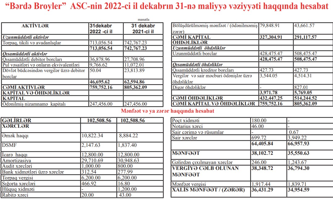 "Bərdə Broyler" ASC 2022-ci ili 36 min manat xalis mənfəət ilə başa vurub. Şirkət 2021-ci ili 35 min manat xalis mənfəət ilə bağlamışdı.