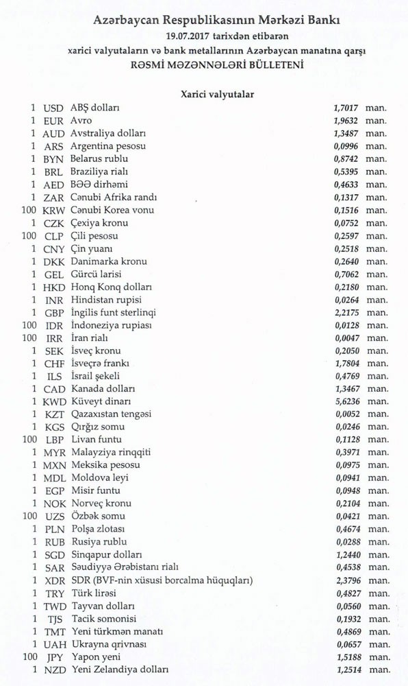 İyulun 19-na Mərkəzi Bankın açıqladığı rəsmi Dollar/manat məzənnəsi İyulun 18-i ilə müqayisədə düşərək 1,7017 manat olub, Avro/manat məzənnəsi isə 1.9632 manata qalxıb.