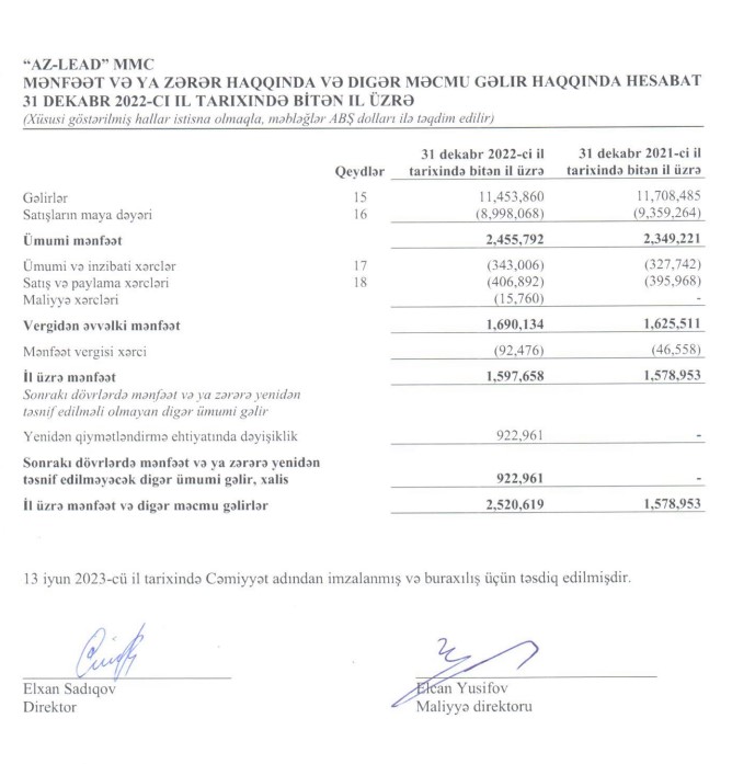"İndrat Holdinq" MMC-yə məxsus olan "Az-Lead" MMC 2022-ci ili 1 milyon 598 min manat xalis mənfəət ilə başa vurub. Şirkət 2021-ci ili 1 milyon 579 min manat xalis mənfəət ilə bağlamışdı.