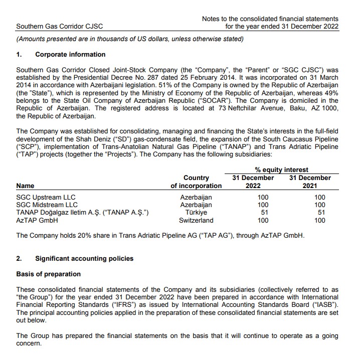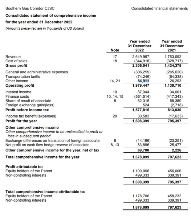"Cənub Qaz Dəhlizi" QSC 2022-ci ili 1 milyard 608 milyon 399 min dollar xalis mənfəət ilə başa vurub. QSC 2021-ci ili 795 milyon 397 min dollar xalis mənfəət ilə bağlamışdı.