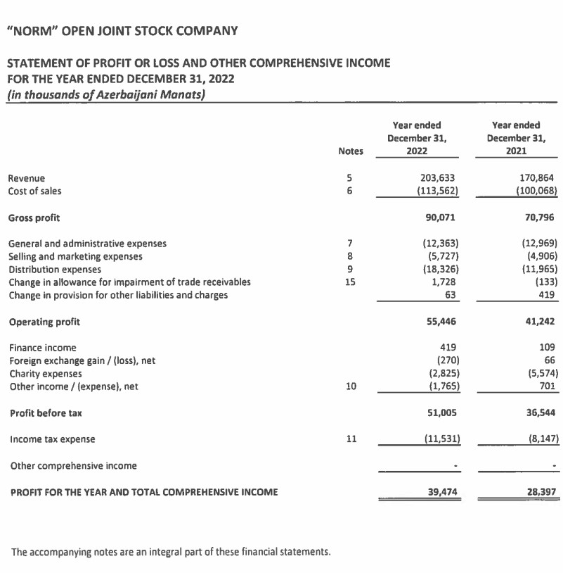Ötən il "Norm" ASC-nin cəmi gəlirləri 205 milyon 843 min manat, cəmi xərcləri 166 milyon 369 min manat təşkil edib. Müqayisə üçün qeyd edək ki, 2021-ci ildə Şirkətin cəmi gəlirləri 172 milyon 159 min manat, cəmi xərcləri isə 143 milyon 762 min manat təşkil etmişdi.