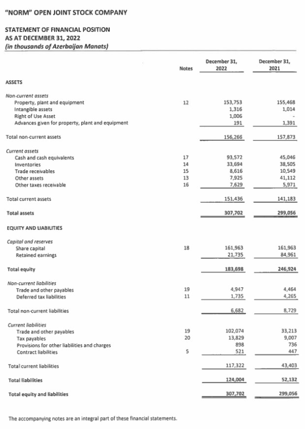31 Dekabr 2022-ci il tarixində "Norm" ASC 307 milyon 702 min manat cəmi aktivlərə malik olub. Şirkət 2021-ci ilin sonunda 299 milyon 56 min manat cəmi aktivlərə malik idi.
