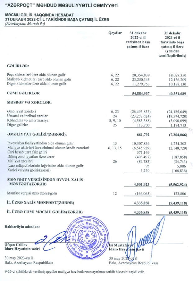 "Azərpoçt" MMC 2022-ci ili 4 milyon 336 min manat xalis mənfəət ilə başa vurub. Halbuki, dövlət şirkəti 2021-ci ili 5 milyon 439 min manat xalis zərər ilə bağlamışdı. "Azərpoçt"un zərərdən mənfəətə keçməsi gəlirlərinin artması, əsasən də maliyyə xidmətlərindən gəlirlərinin artması hesabınadır. Ötən il Şirkətin maliyyə xidmətləri üzrə əldə etdiyi gəlirlərin poçt xidmətləri üzrə əldə etdiyi gəlirləri üstələməsi diqqəti çəkir.