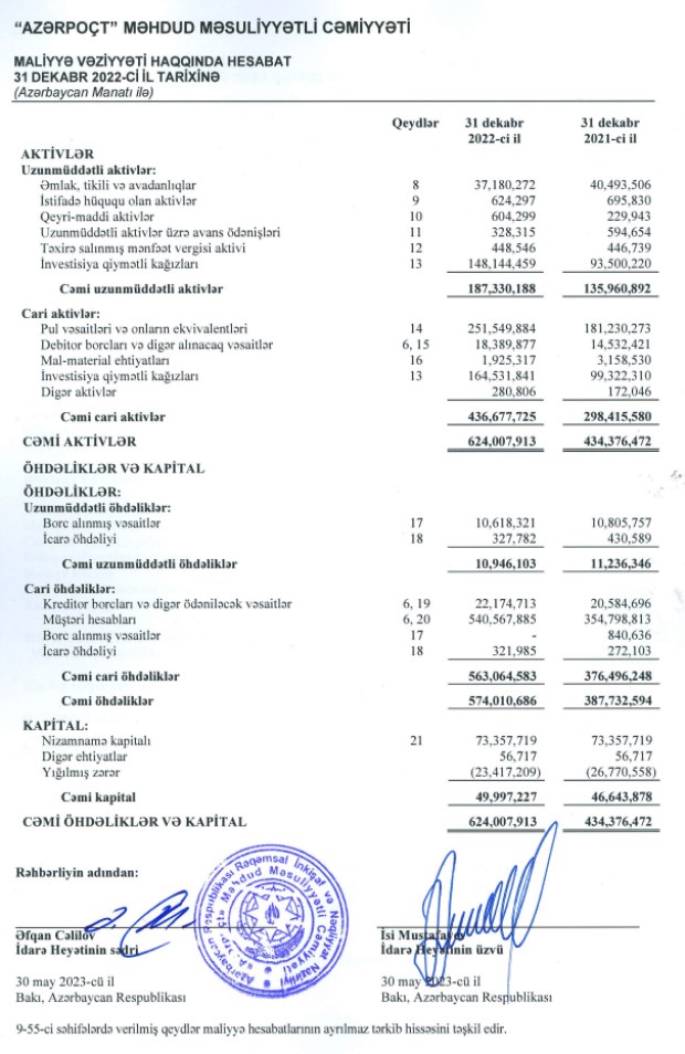 31 dekabr 2022-ci il tarixində "Azərpoçt" MMC 624 milyon 8 min manabt cəmi aktivlərə malik olub. Şirkət 2021-ci ilin sonunda 434 milyon 376 min manat cəmi kativlərə malik idi. Beləliklə, ötən il "Azərpoçt"un cəmi aktivləri 189 milton 631 min manat artıb. Ötən il Şirkətin qiymətli kağızlara investisiyaları isə 65 milyon 210 min manat aratarq 164 milyon 532 min manata yüksəlib.