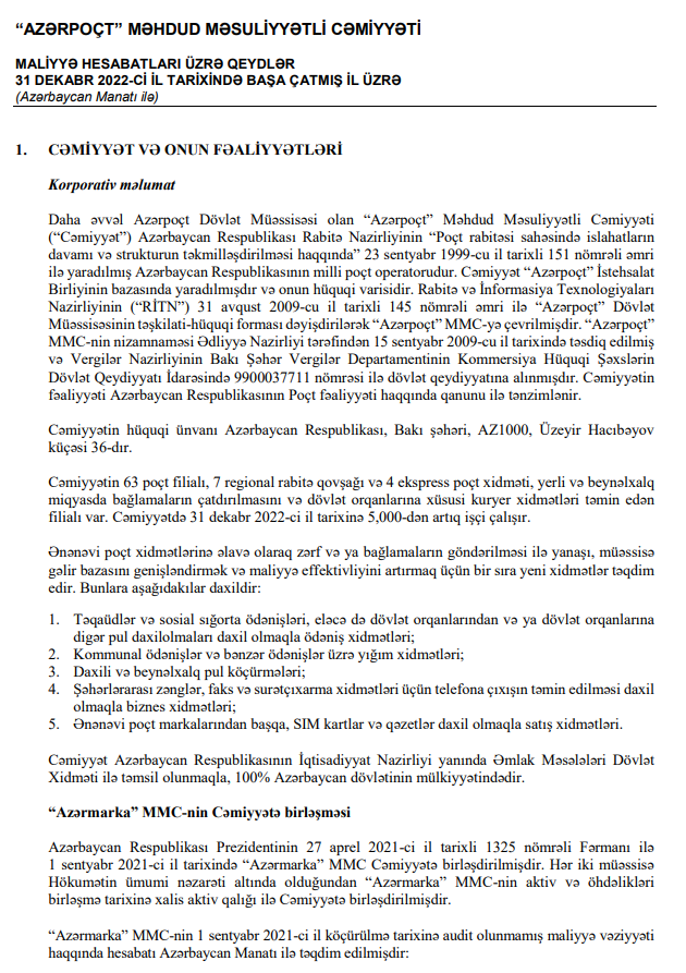 Azərbaycan Respublikası Prezidentinin 27 aprel 2021-ci il tarixli 1325 nömrəli Fərmanı ilə 1 sentyabr 2021-ci il tarixində “Azərmarka” MMC Cəmiyyətə birləşdirilmişdir. Hər iki müəssisə Hökumətin ümumi nəzarəti altında olduğundan “Azərmarka” MMC-nin aktiv və öhdəlikləri birləşmə tarixinə xalis aktiv qalığı ilə Cəmiyyətə birləşdirilmişdir.