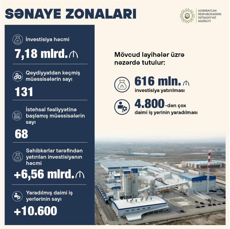 İndiyədək sənaye zonaları üzrə ümumi investisiya həcmi 7,18 milyard manat olmaqla 131 sahibkarlıq subyektinə rezident statusu verilib və onlardan 68-i istehsal fəaliyyətinə başlayıb.