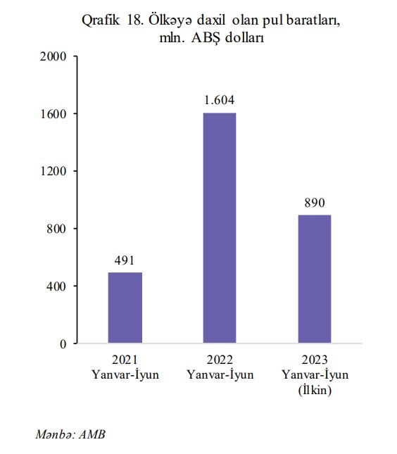 İlkin rəqəmlərə əsasən 2023-cü ilin birinci yarısı ərzində (yanvar-iyun) Azərbaycana daxil olan pul baratlarının həcmi 890 milyon dollar təşkil edib.