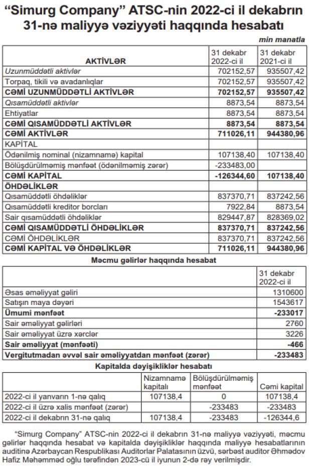 “Simurg Company” ATSC 2022-ci ili 233 min 483 manat zərər ilə başa vurub.