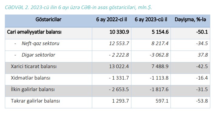 Müqayisə üçün qeyd edək ki, 2022-ci ilin 6 ayı üzrə cari əməliyyatlar hesabının profisiti 10.3 milyard dollar və ya ÜDM-in 27.6%-ni təşkil etmişdi (2021-ci ilin 6 ayı üzrə 1.9 milyard dollar profisit olmuşdur). Neft-qaz sektoru üzrə cari əməliyyatlar hesabının profisiti ötən ilin müvafiq dövrünə nəzərən 2.7 dəfə artaraq 12.5 milyard dollar, qeyri-neft sektoru üzrə cari əməliyyatlar hesabının kəsiri isə 17.9% azalaraq 2.2 milyard dollar məbləğində olmuşdu.