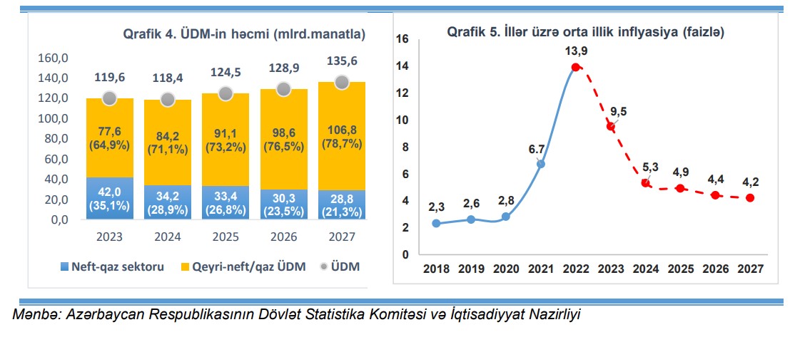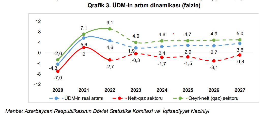 Marja.az-ın məlumatına görə, 2024-cü ilin dövlət və icmal büdcələri üzrə layihələrin təqdimatında bildirilir ki, Azərbaycan Respublikasının İqtisadiyyat Nazirliyi tərəfindən hazırlanmış 2024-cü il və sonrakı üç il üzrə baza -ssenaridə (neftin bir barelinin orta illik ixrac qiyməti 2024-2027-ci illər üçün 60 ABŞ dolları fərz edilməklə) makroiqtisadi proqnoz göstəricilərinə əsasən, 2024-cü ildə ölkədə ÜDM-in real ifadədə 2,4 faiz artaraq 118,4 milyard manat, o cümlədən qeyri-neft (qaz) ÜDM-in real ifadədə 4,6 faiz artaraq 84,2 milyard manat təşkil edəcəyi proqnozlaşdırılır. Növbəti ildə ÜDM-in tərkibində qeyri-neft (qaz) sektorunun payının cari ilin proqnozuna nəzərən 6,2 faiz-bənd artımla 71,1 faizə çatacağı gözlənilir. Proqnozlara əsasən, 2024-cü ildə neft-qaz sektoru üzrə ÜDM real ifadədə 1,7 faiz azalacaqdır.