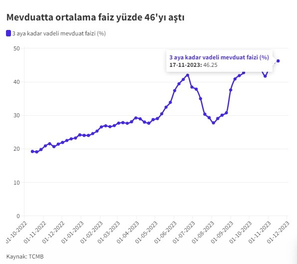 Marja.az xəbər verir ki, Türkiyə Respublikası Mərkəzi Bankının (TCMB) məlumatına görə, 17 Noyabr həftəsində əmanətlərin əksəriyyətini təşkil edən 3 aya qədər müddətli əmanətlər üzrə orta faiz dərəcəsi 46,25%ə yüksəlib. Bu, son 20 ildə müddətli əmanətlər üzrə ən yüksək faiz dərəcəsidir.