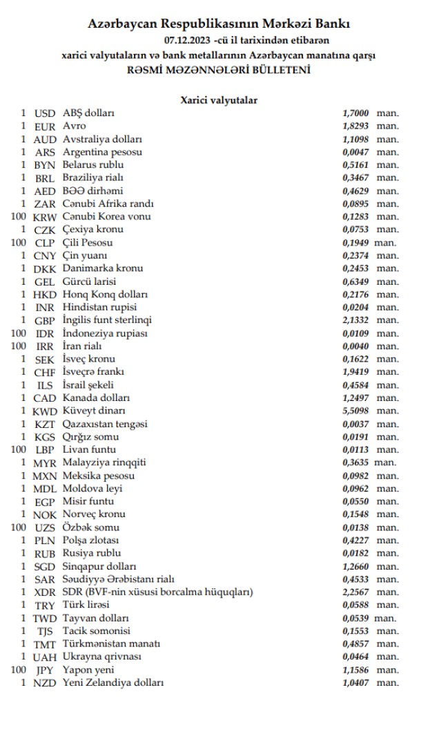 Rəsmi məzənnələr açıqlandı