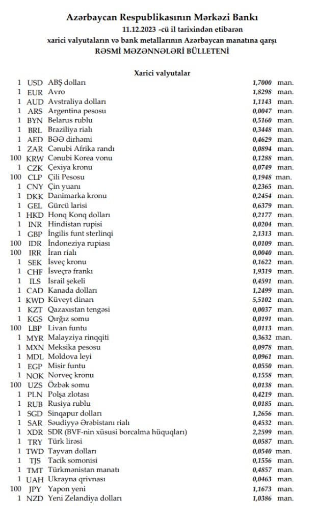 Rəsmi məzənnələr açıqlandı