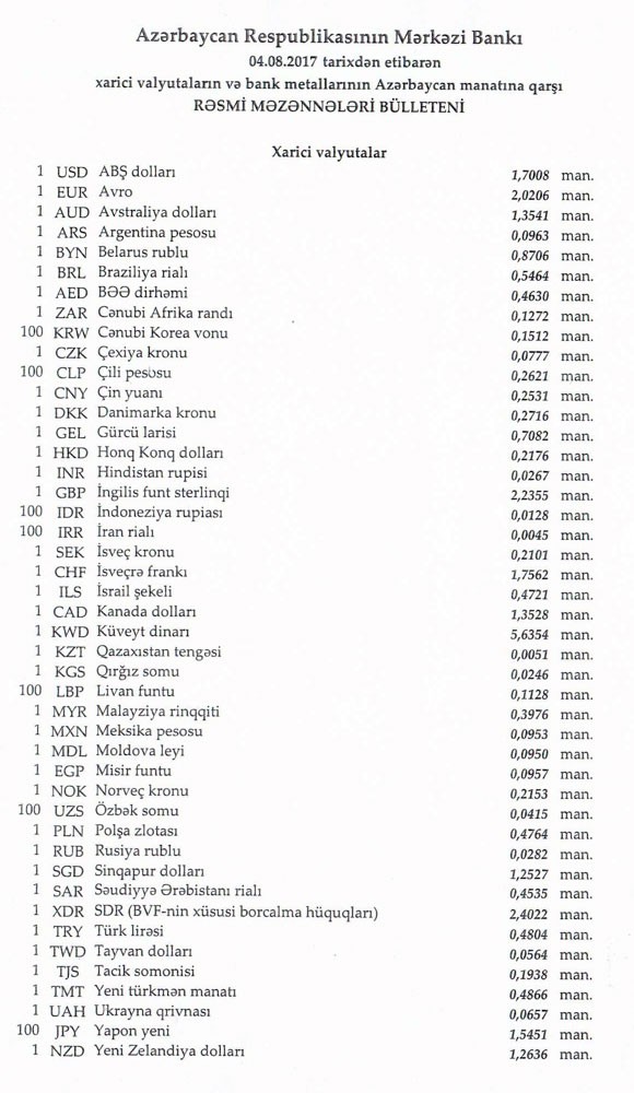 Avqustun 4-nə Mərkəzi Bankın açıqladığı rəsmi Dollar/manat məzənnəsi Avqustun 3-ü ilə müqayisədə dəyişməyərək 1,7008 manat olub, Avro/manat məzənnəsi isə 2.0206 manata yüksəlib.
