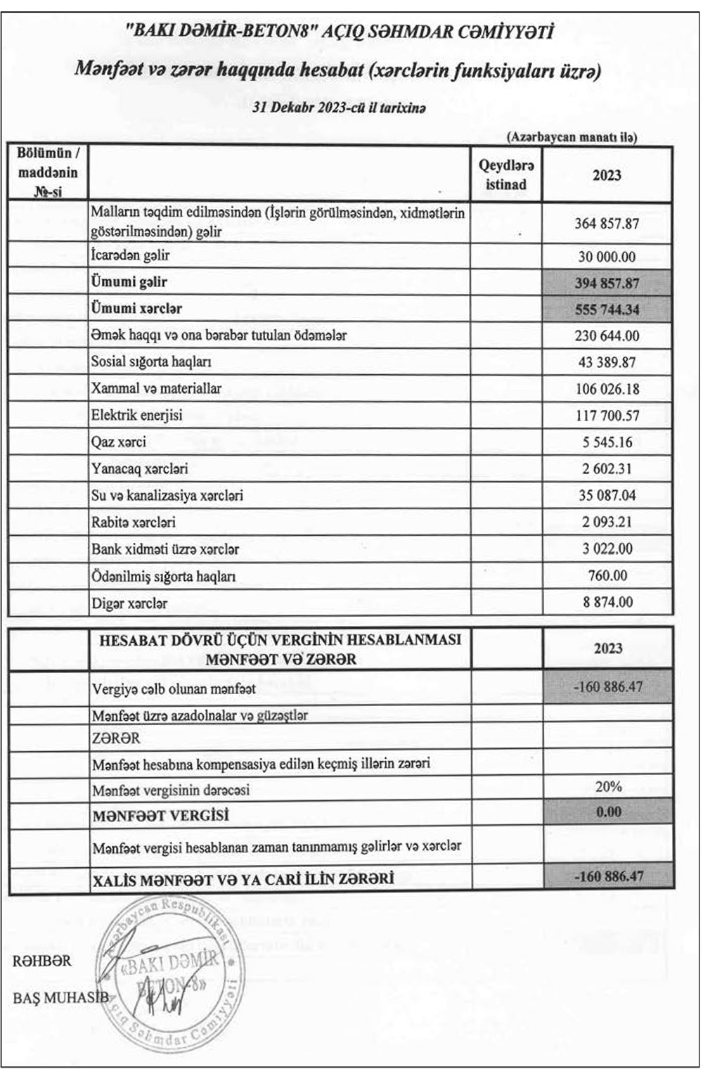 "Bakı Dəmir-Beton 8" ASC 2023-cü ili 161 min manat xalis zərər ilə başa vurub.
