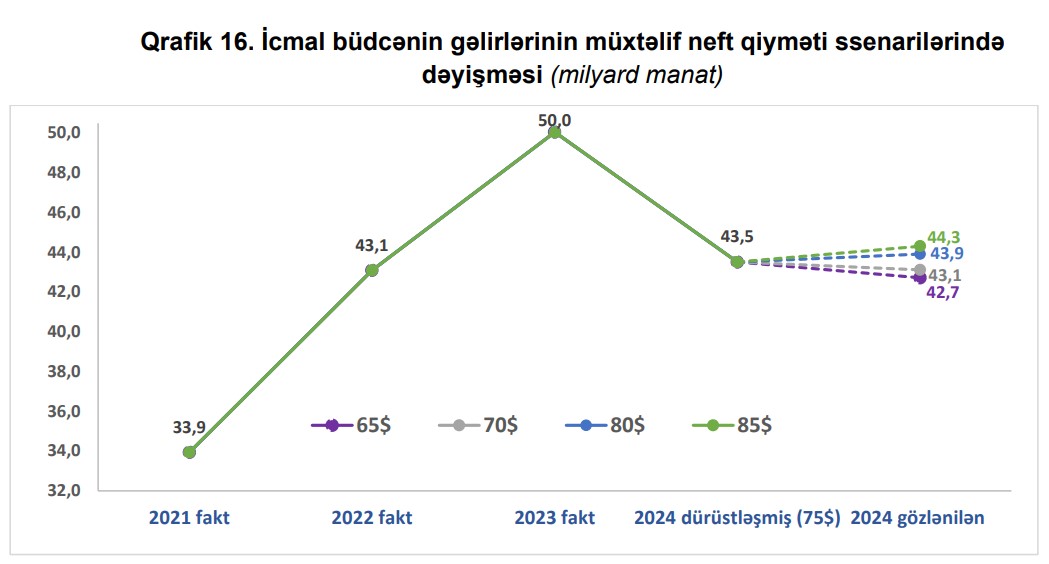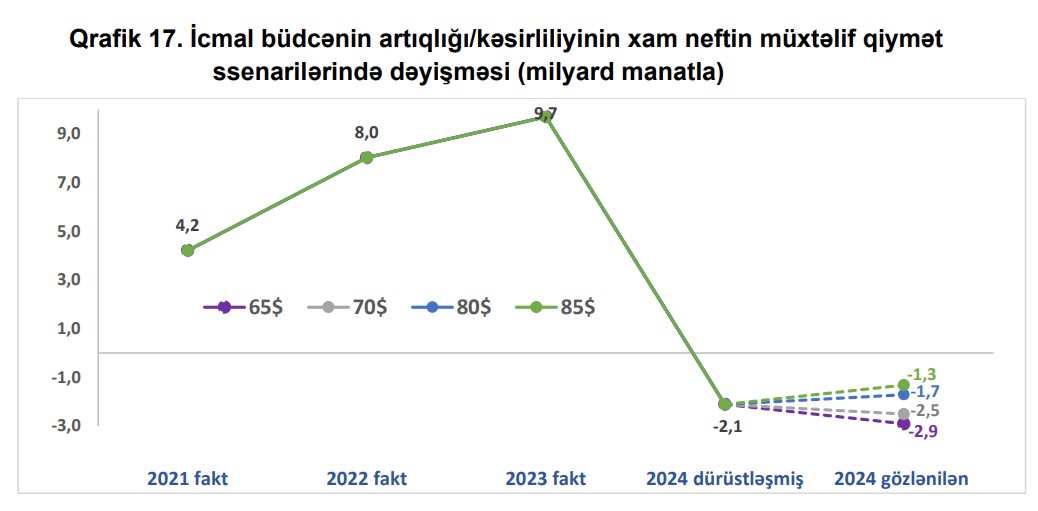 Dövlət Neft Fondundan dövlət büdcəsinə nəzərdə tutulan transfertin tam şəkildə köçürülməsi və cari ilin altı aylıq faktiki daxilolmaları nəzərə alınmaqla, 2024-cü ildə xam neftin bir barelinin qiymətinin 65 ABŞ dolları ssenarisində icmal büdcədə 2,9 milyard manat kəsir, 85 ABŞ dolları ssenarisində isə 1,3 milyard manat kəsir olacağı gözlənilir.