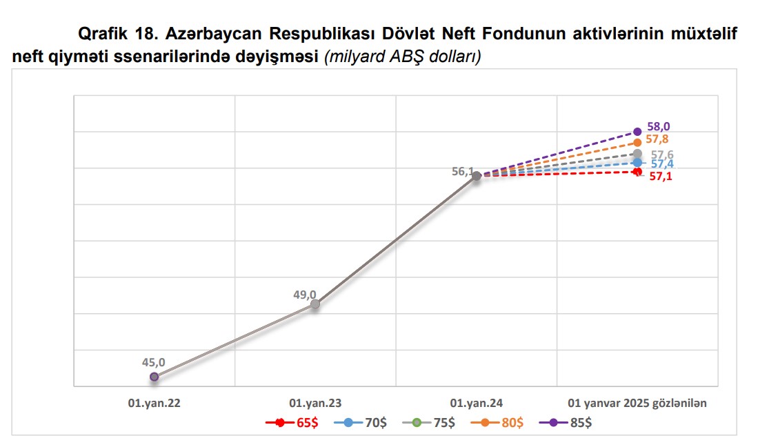 2024-cü ilin altı aylıq faktiki daxilolmaları nəzərə alınmaqla xam neftin bir barelinin müxtəlif qiymət ssenarilərində 01 yanvar 2025-ci il tarixinə Dövlət Neft Fondunun aktivlərinin aşağıdakı qrafikdə göstərilmişdir.