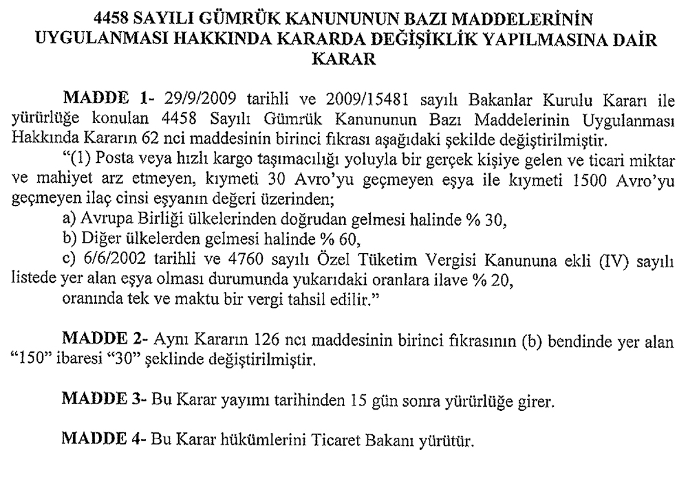 Müvafiq olaraq, fiziki şəxsə poçt və ya sürətli yük daşımaları ilə gələn və kommersiya xarakteri daşımayan, dəyəri 30 avrodan çox olmayan mallar və dəyəri 1500 avrodan çox olmayan əczaçılıq malları birbaşa Avropa Birliyi ölkələrindən gələrsə 30 faiz, digər ölkələrdən gələrsə 60 faiz vergi tutulacaq. Hazırda Avropa Birliyi ölkələrində alınan mallara görə vergi 18%, digər ölkələrdən alınan mallara 30% təşkil edir.