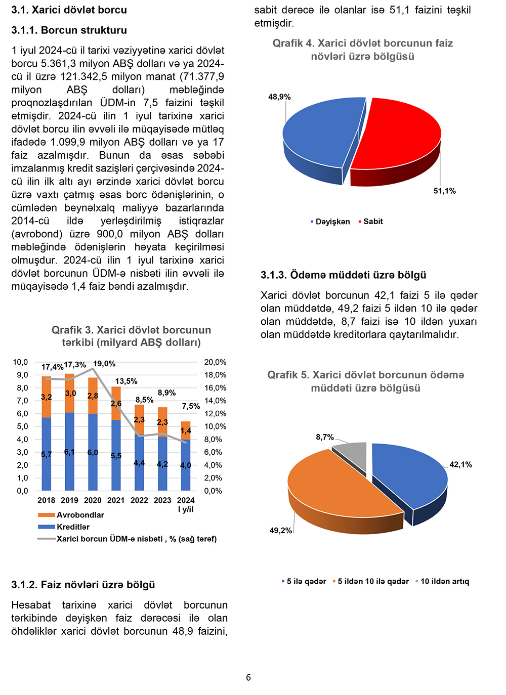 1 iyul 2024-cü il tarixi vəziyyətinə xarici dövlət borcu 5 milyard 361,3 milyon ABŞ dolları və ya 2024- cü il üzrə 121 milyard 342,5 milyon manat (71 milyard 377,9 milyon ABŞ dolları) məbləğində proqnozlaşdırılan ÜDM-in 7,5 faizini təşkil etmişdir. 2024-cü ilin 1 iyul tarixinə xarici dövlət borcu ilin əvvəli ilə müqayisədə mütləq ifadədə 1 milyard 99,9 milyon ABŞ dolları və ya 17 faiz azalmışdır. Bunun da əsas səbəbi imzalanmış kredit sazişləri çərçivəsində 2024- cü ilin ilk altı ayı ərzində xarici dövlət borcu üzrə vaxtı çatmış əsas borc ödənişlərinin, o cümlədən beynəlxalq maliyyə bazarlarında 2014-cü ildə yerləşdirilmiş istiqrazlar (avrobond) üzrə 900 milyon ABŞ dolları məbləğində ödənişlərin həyata keçirilməsi olmuşdur. 2024-cü ilin 1 iyul tarixinə xarici dövlət borcunun ÜDM-ə nisbəti ilin əvvəli ilə müqayisədə 1,4 faiz bəndi azalmışdır.