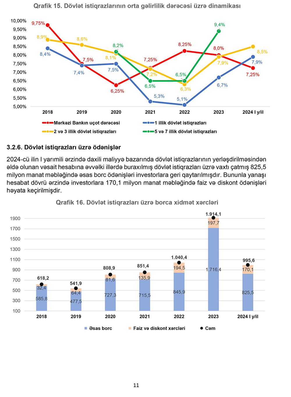 1 iyul 2024-cü il tarixinə daxili dövlət borcunun 7 milyard 280,7 milyon manatı dövriyyədə olan dövlət qiymətli kağızlarının, 9 milyard 291,2 milyon manatı isə hökumətin üzərinə götürdüyü dövlət zəmanətli öhdəliklərinin payına düşür.