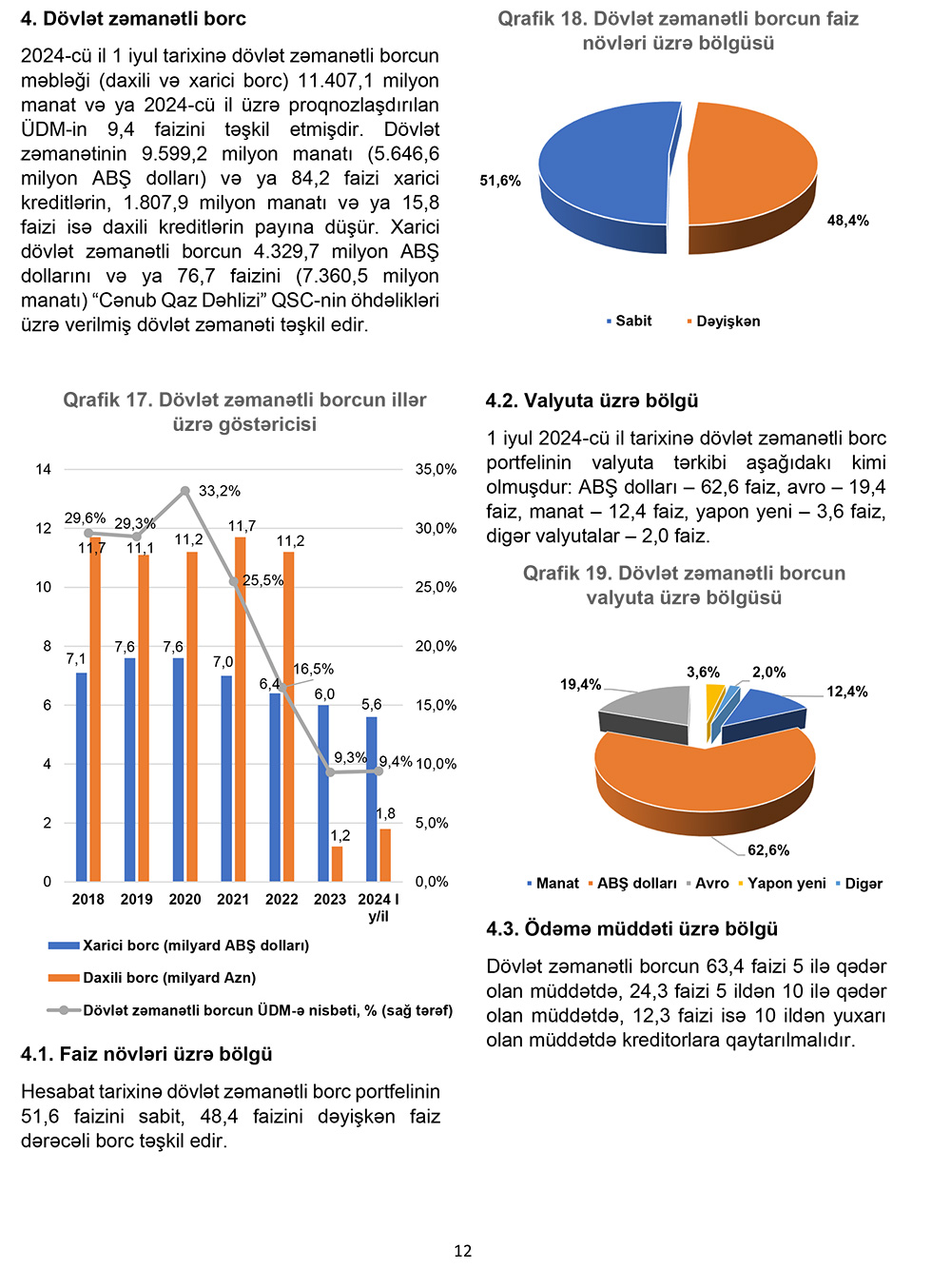 Qeyd edilib ki, ümumi dövlət borcunun 9 milyard 114,2 milyon manatı (5 milyard 361,3 milyon ABŞ dolları) və ya 35,5 faizi xarici dövlət borcunun, 16 milyard 571,9 milyon manatı və ya 64,5 faizi daxili dövlət borcunun payına düşür.