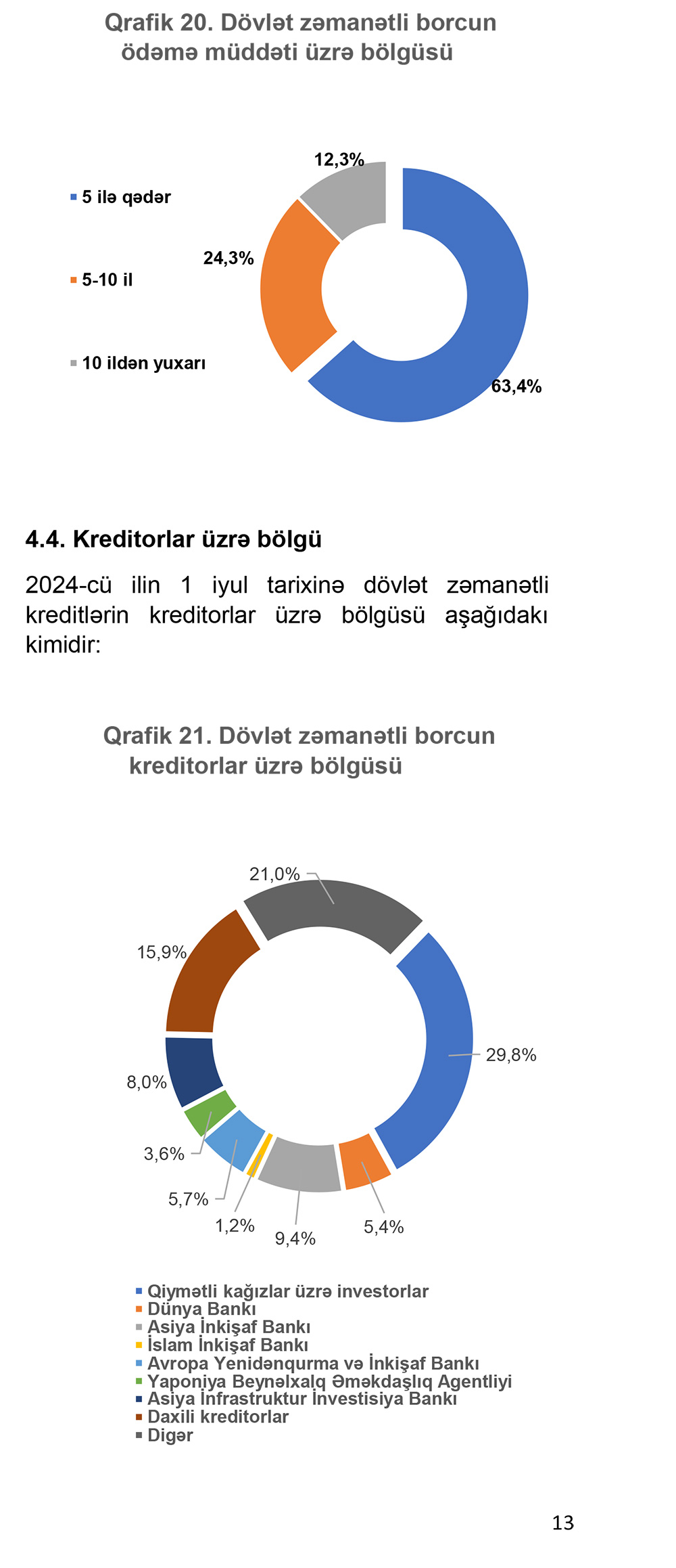 Xarici dövlət borcunun 42,1 faizi 5 ilə qədər olan müddətdə, 49,2 faizi 5 ildən 10 ilə qədər olan müddətdə, 8,7 faizi isə 10 ildən yuxarı olan müddətdə kreditorlara qaytarılmalıdır.