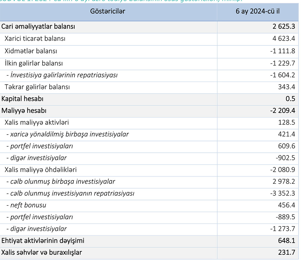 2024-cü ilin 6 ayı ərzində tədiyə balansının ehtiyat aktivləri 648.1 mln. dollar artmışdır.