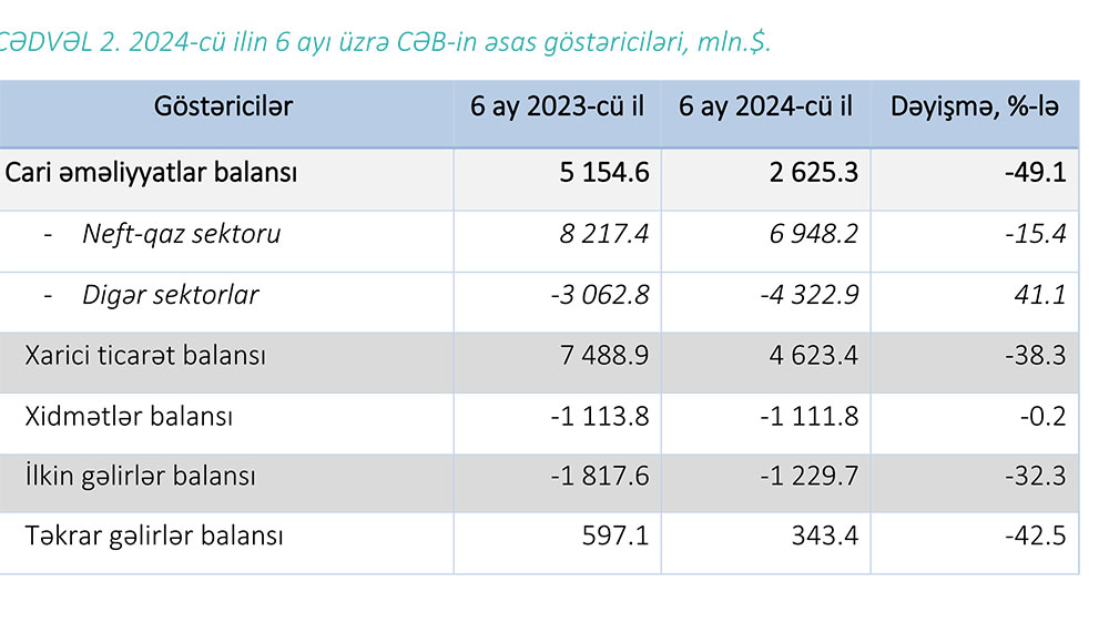 Neft-qaz sektoru üzrə cari əməliyyatlar hesabının profisiti azalıb, qeyri neft-qaz sektoru üzrə cari əməliyyatlar hesabının kəsiri isə kəskin artıb.2024-cü ilin 6 ayı üzrə tədiyə balansı xarici mühitdə formalaşan müxtəlif istiqamətli meyllərdən təsirlənmişdir. Cari əməliyyatlar balansında 2.6 mlrd. dollar həcmində profisit formalaşmış, kapital və maliyyənin hərəkəti balansında (əsasən maliyyə öhdəliklərinin azalması ilə əlaqədar) isə 2.2 mlrd. dollarlıq kəsir yaranmışdır.