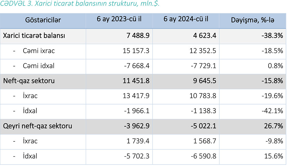 Xarici ticarət balansı 2024-cü ilin 6 ayı üzrə xarici ticarət dövriyyəsi 20.1 mlrd. dollar təşkil etmiş, neft-qaz sektoru üzrə 9.6 mlrd. dollar həcmində profisit qeyri neft-qaz sektoru üzrə 5.0 mlrd. dollar həcmində kəsiri bağlamışdır. Nəticədə hesabat dövründə xarici ticarət balansında 4.6 mlrd. dollar həcmində profisit yaranmışdır. 2024-cü ilin 6 ayında Azərbaycanın dünyanın 169 ölkəsi ilə ticarət əlaqələri olmuşdur. Xarici ticarətin 14.4%-i MDB üzvü olan ölkələrin, 85.6%-i isə digər xarici ölkələrin payına düşür.