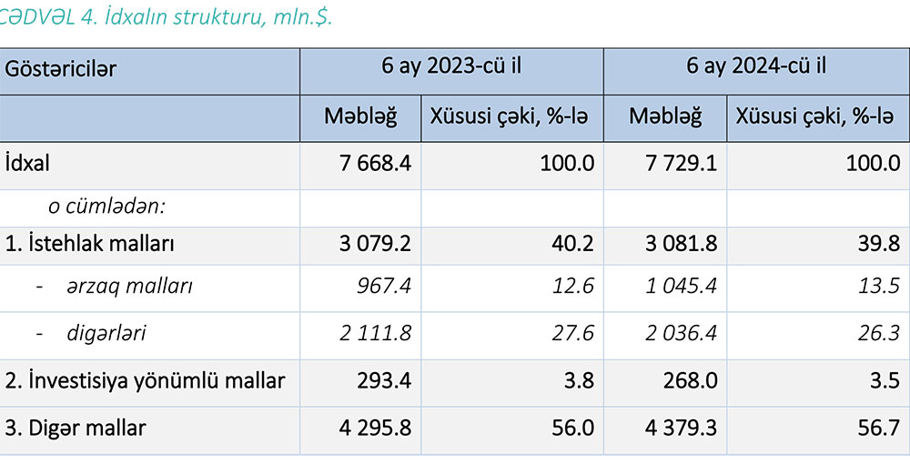 2024-cü ilin 6 ayı üzrə əmtəə idxalı ö.i.m.d.n. 0.8% artaraq 7.7 mlrd. dollar təşkil etmişdir, o cümlədən istehlak mallarının idxalının ümumi dəyəri isə 3.1 mlrd. dollar olmuş, bunun da 1.0 mlrd. dolları ərzaq məhsullarının payına düşür. Qeyri neft-qaz sektoru üzrə idxal 15.6% artaraq 6.6 mlrd. dollar olmuşdur. Qeyri neft-qaz idxalının strukturunda gəmilər, qayıqlar və üzən konstruksiyaların (3.6 dəfə), kərə yağının (52.7%), yük avtomobillərinin (44.0%), metalların (35.9%), hesablama maşınların (24.1%), kommutasiya qurğuların (22.8%), qazanlar, avadanlıq, mexaniki qurğuların (22.3%), tərəvəz məhsullarının (12.6%), ətir və kosmetik vasitələrinin (10.2%), bitki yağlarının (8%), şəkərin (6%), mebel məhsullarının (2.4%), daş və şüşə məmulatlarının (2.3%), alkoqollu və alkoqolsuz içkilərinin (1.8%), minik avtomobillərinin (0.5%) və sabun və yuyucu vasitələrinin (0.3%) idxalı artmışdır. Bu dövrdə, uçuş aparatların (94.0%), traktorların (31.2%), dənli bitkilərin (25.2%), əczaçılıq məhsullarının (23.1%), elektrik maşınların və aparaturanın (12.7%), ağac məmulatlarının (6.4%), tütün məhsullarının (4.7%) və kağız məmulatlarının (1.2%) idxalı isə azalmışdır. İdxalın strukturunda xarici investisiyalar hesabına gətirilmiş maşın-avadanlıqların və malların xüsusi çəkisi 3.5% təşkil edərək 0.3 mlrd. dollar olmuşdur.