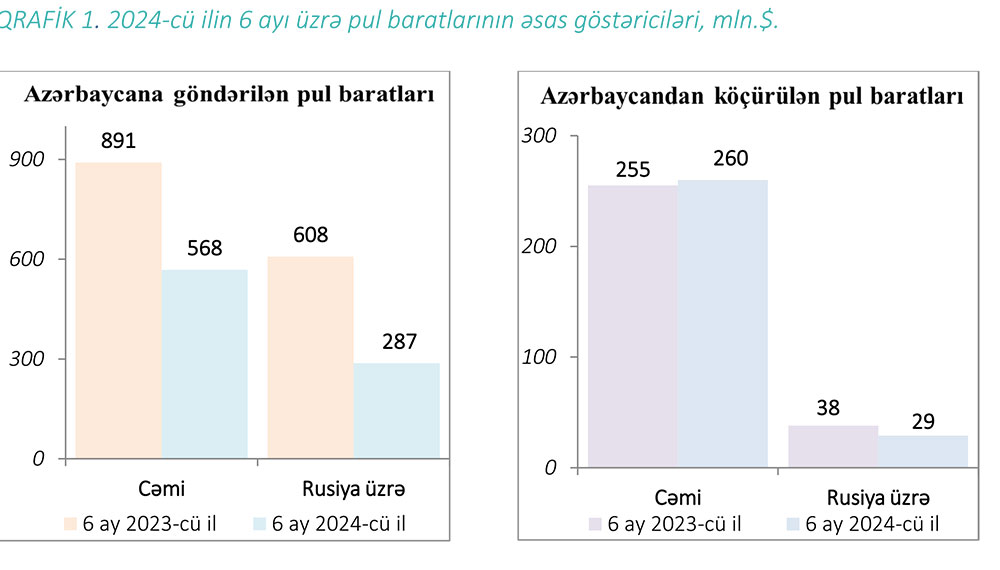 Ölkəyə göndərilən pul baratlarının həcmi 36.3% azalaraq 567.8 mln. dollar, ölkədən köçürülən pul baratlarının həcmi isə 1.9% artaraq 259.6 mln. dollar olmuşdur. Nəticədə pul baratları üzrə 308.2 mln. dollar müsbət saldo yaranmışdır.