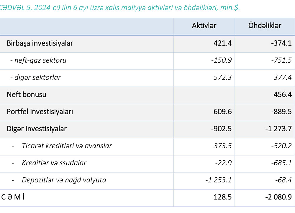 3 2024-cü ilin 6 ayı üzrə ölkənin xalis maliyyə aktivləri 128.5 mln. dollar artmışdır. Bu göstərici xaricə yönəldilmiş birbaşa investisiyalar (421.4 mln. dollar), portfel investisiyaları (609.6 mln. dollar) və digər investisiyalar (-902.5 mln. dollar) hesabına formalaşmışdır.