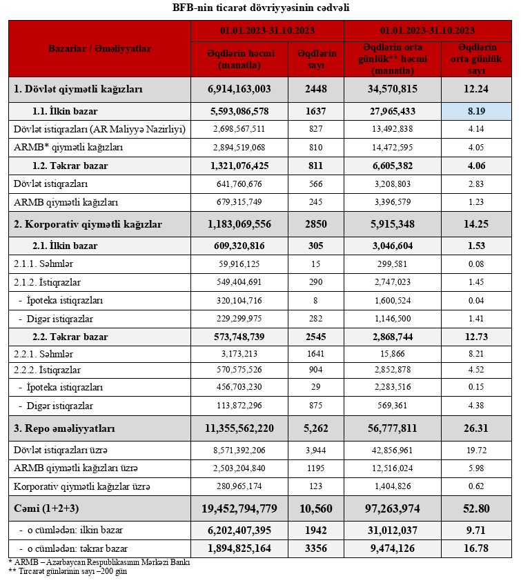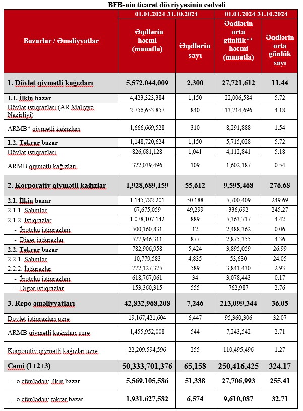 Bakı Fond Birjasında 2024-cü ilin yanvar-oktyabr ayları ərzində qiymətli kağızlar üzrə keçirilən əməliyyatların ümumi həcmi 50 milyard 333 milyon 701 min 76 manat təşkil edib. Müqayisə üçün qeyd edək ki, Bakı Fond Birjasında 2023-cü ilin yanvar-oktyabr ayları ərzində qiymətli kağızlar üzrə keçirilən əməliyyatların ümumi həcmi 19 milyard 452 milyon 795 min manat təşkil etmişdi.