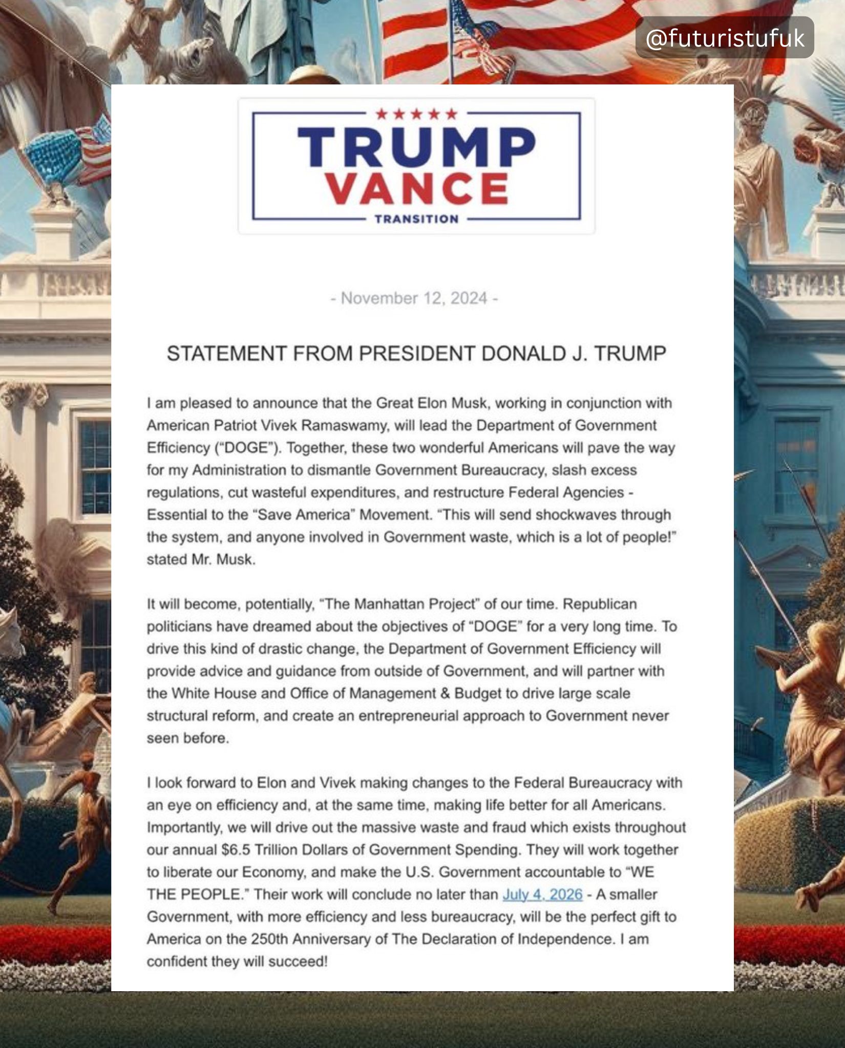 Donald Tramp bəyan edib ki, Mask və Ramasvami hökumət bürokratiyasının aradan qaldırılmasına, həddindən artıq tənzimləmələrin azaldılmasına, israf olan xərclərin azaldılmasına və federal qurumların yenidən qurulmasına cavabdeh olacaqlar.