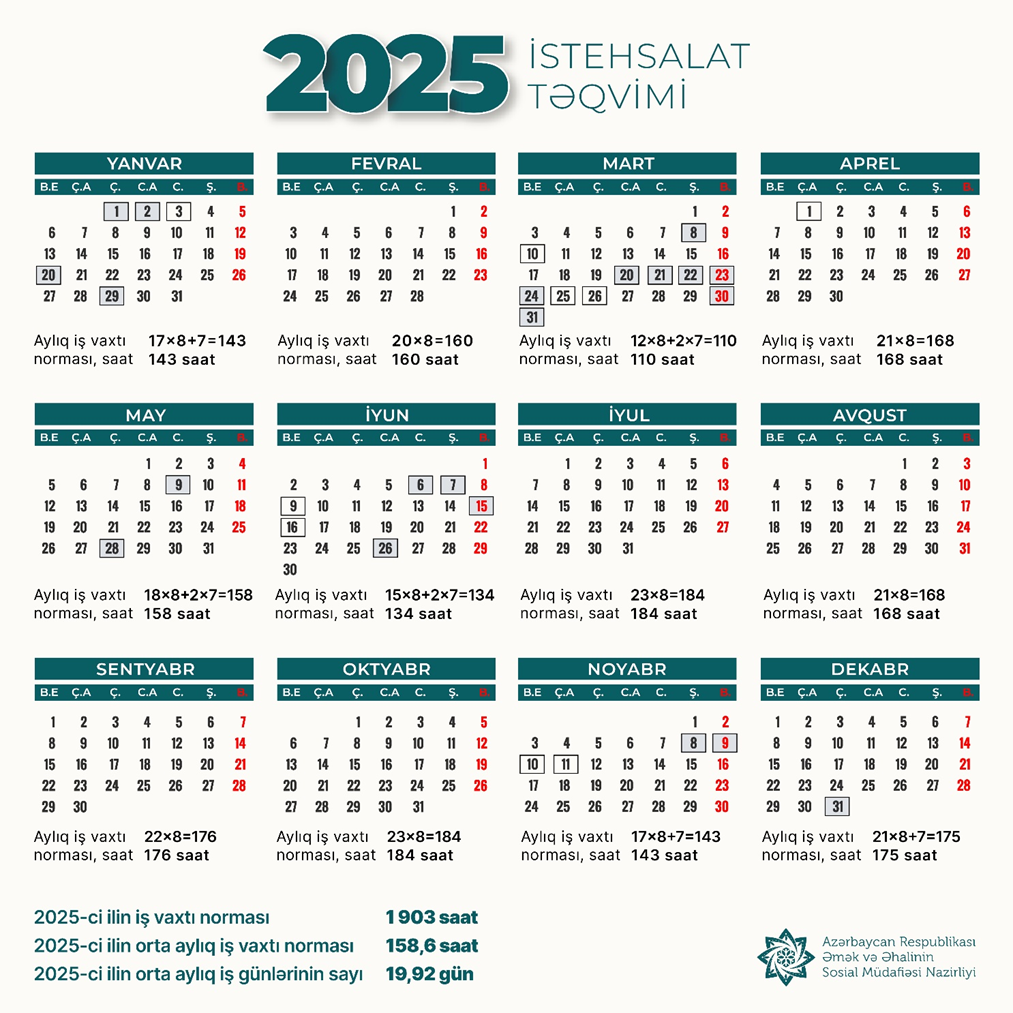 Qanunvericiliyə uyğun olaraq 2025-ci il üçün 40 saatlıq iş həftəsində iş vaxtının illik norması 1903 saat təşkil edir (230x8+9x7=1903 saat).