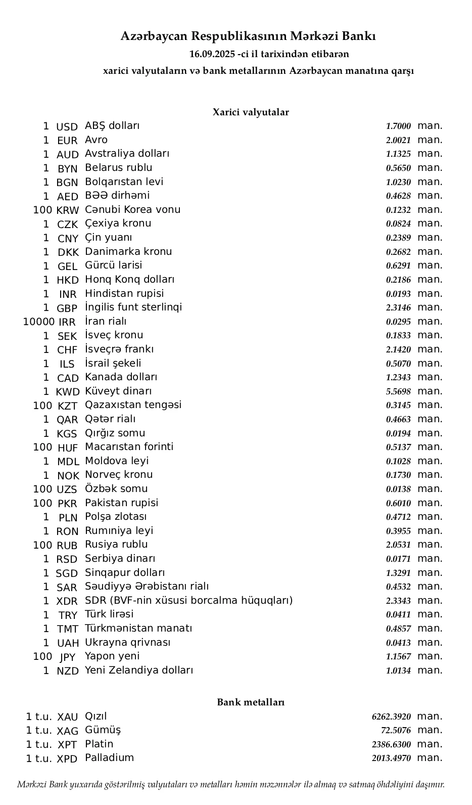 Rəsmi məzənnələr açıqlandı