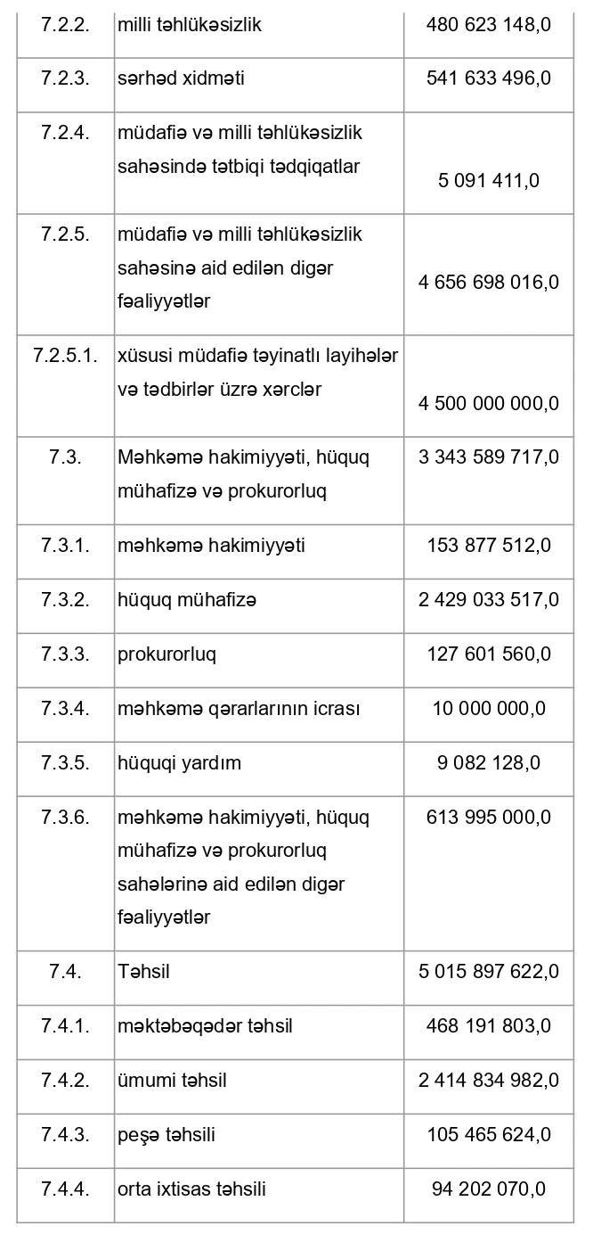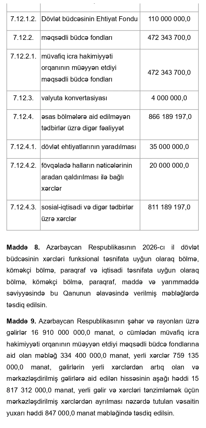 Azərbaycan Respublikasının 2026-cı il icmal büdcəsinin xərclərinin yuxarı həddinin məbləği 48 milyard 839 milyon 322,6 min manat, 2026-cı il icmal büdcəsi kəsirinin yuxarı həddinin məbləği 16 milyard 902 milyon 226,6 min manat məbləğində nəzərdə tutulur.