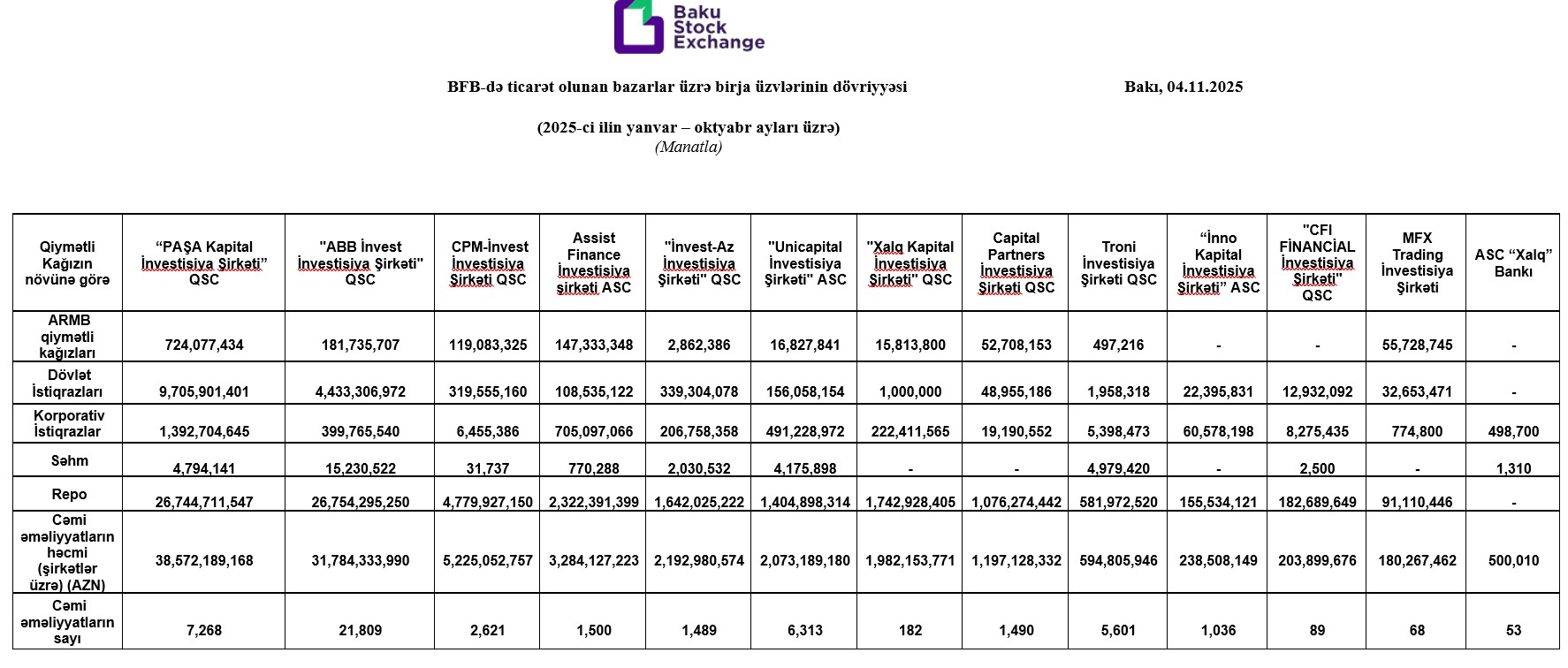 Birjadan Marja-ya verilən məlumata görə, 2025-ci ilin yanvar-oktyabr ayları ərzində “PAŞA Kapital İnvestisiya Şirkəti” QSC 38 milyard 572 milyon 189 manat dövriyyə ilə 1-ci, "ABB İnvest İnvestisiya Şirkəti" QSC 31 milyard 784 milyon 332 min manat dövriyyə ilə 2-ci, "CPM-İnvest İnvestisiya Şirkəti" QSC 5 milyard 225 milyon 53 min manat dövriyyə ilə 3-cü, "Assist Finance İnvestisiya şirkəti "ASC 3 milyard 284 milyon 127 min manat dövriyyə ilə 4-cü, "İnvest-AZ İnvestisiya Şirkəti" QSC 2 milyard 192 milyon 980 min manat dövriyyə ilə 5-ci olub.