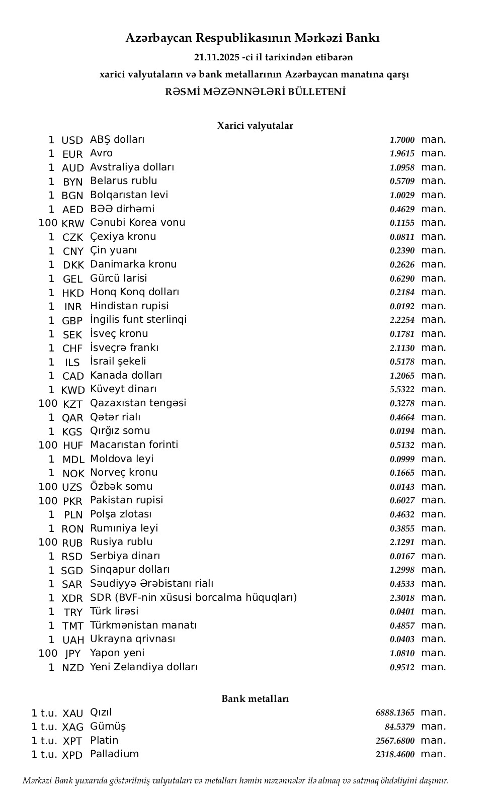 Rəsmi məzənnələr açıqlandı