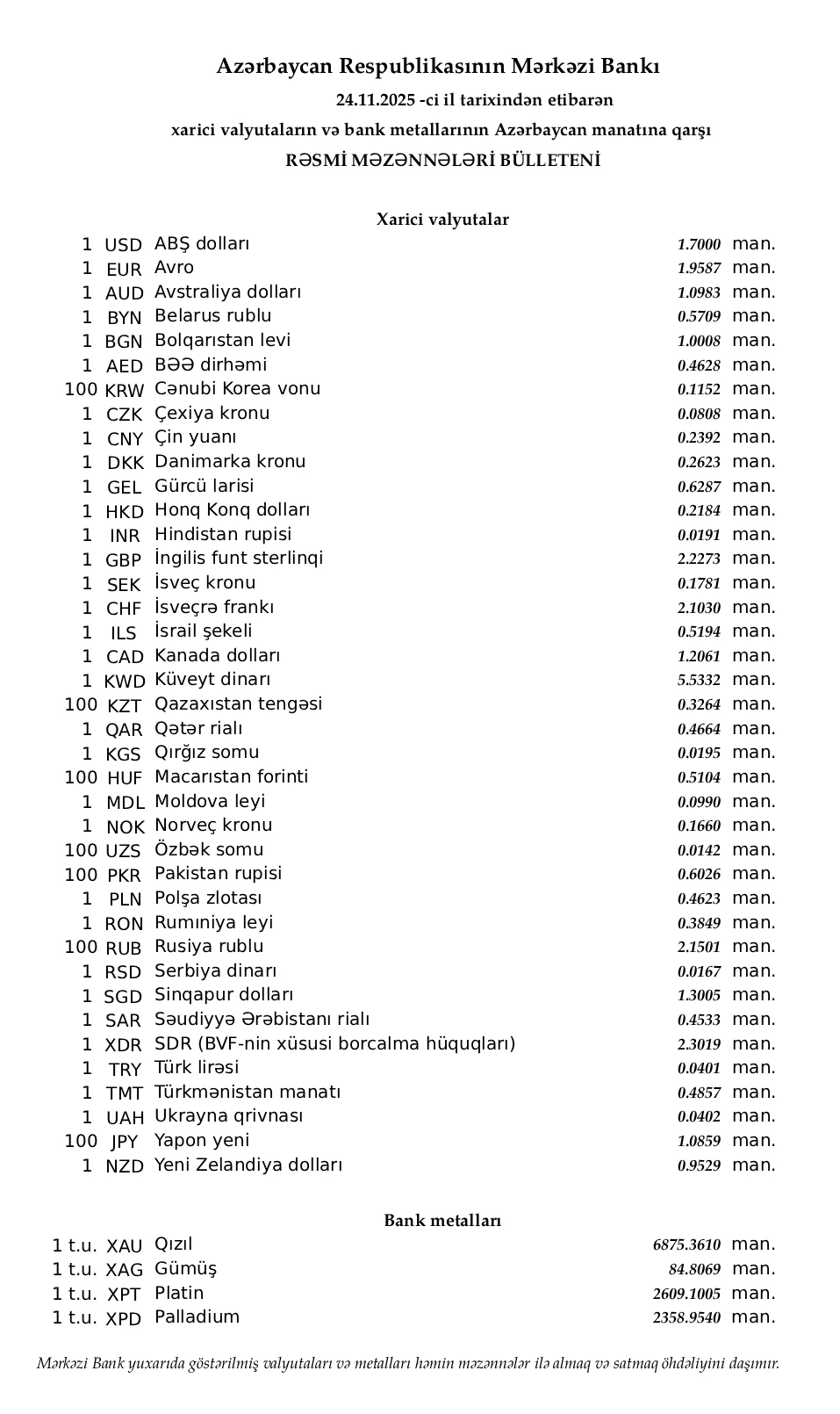 Rəsmi məzənnələr açıqlandı