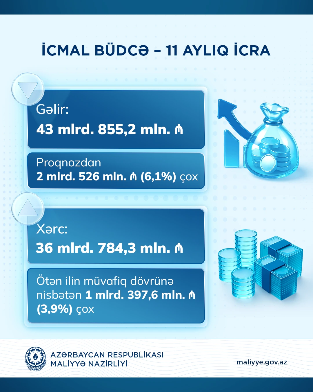 2025-ci ilin 11 ayı ərzində icmal büdcənin xərcləri 36 milyard 784,3 milyon manat məbləğində icra edilib ki, bu da ötən ilin 11 aylıq icra göstəriciləri ilə müqayisədə 1 397,6 milyon manat və ya 3,9 faiz çoxdur.