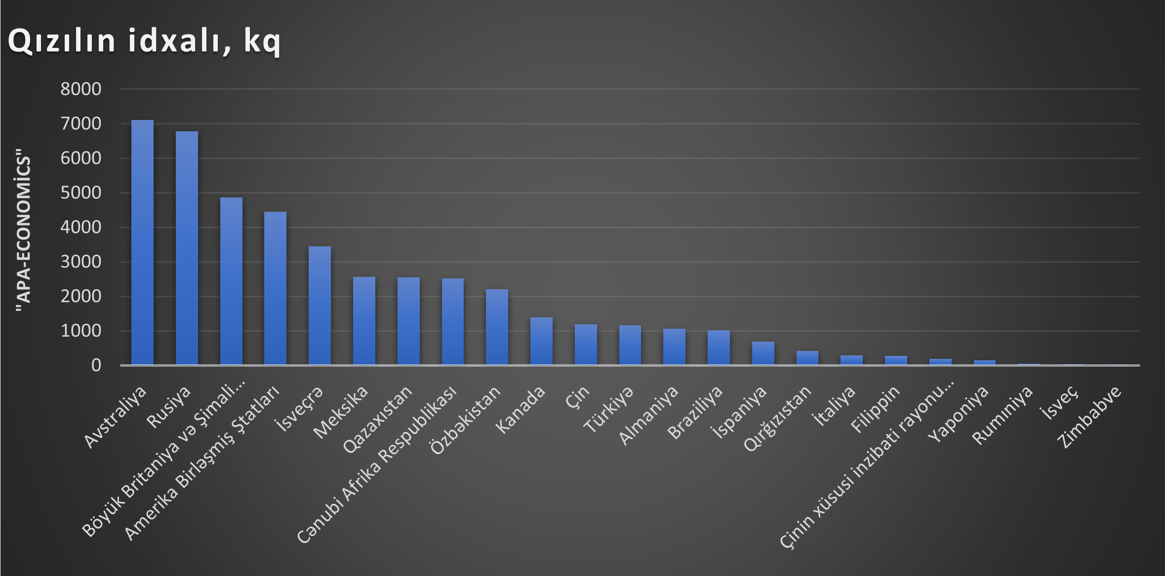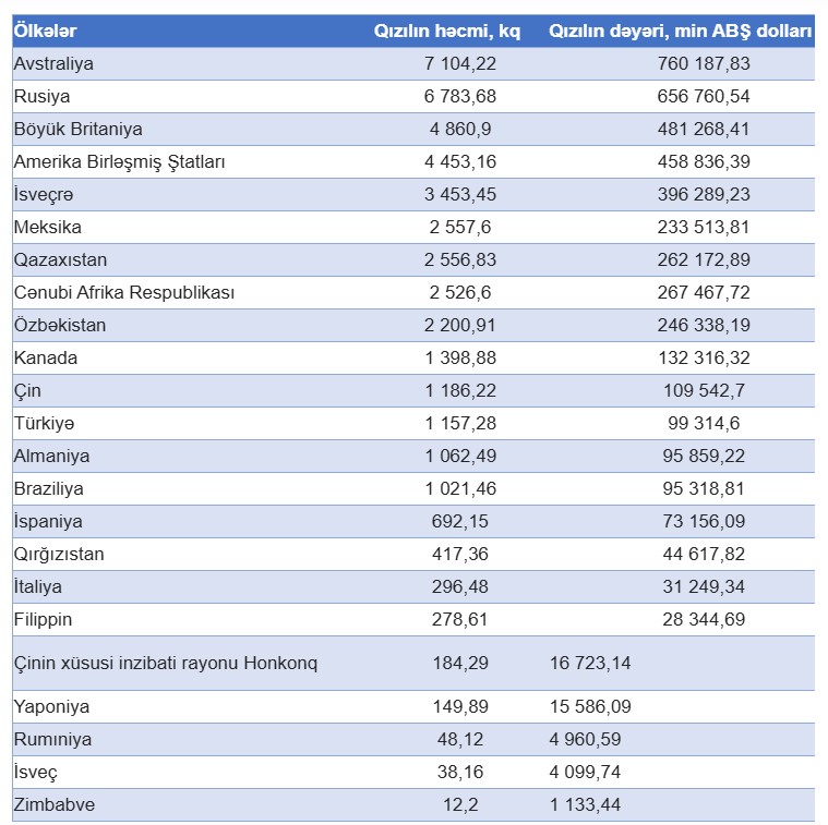 Qeyd edək ki, bu ilin ilk 10 ayında Azərbaycanda qızıl istehsalı 2592.7 kq təşkil edib. Bu dövrdə Azərbaycandan İsveçrəyə 276 milyon 824.5 min ABŞ dolları dəyərində 3970.7 kq emal olunmamış qızıl ixrac edilib. Bu məhsulun 1 kiloqramının orta ixrac qiyməti isə 69 min 715 ABŞ dolları təşkil edib.