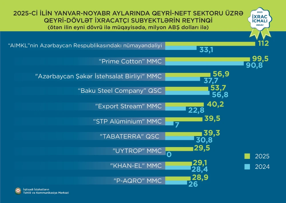 2025-ci ilin yanvar-noyabr ayları üzrə hazırlanmış qeyri-dövlət ixracatçı subyektlərin reytinqində ilk onluqda aşağıdakı şirkətlər təmsil olunublar: "Azərbaycan İnterneyşnl Mayninq Kompani Limited Şi r kət i "nin Azərbayc an Respubl i ka s ında k ı Nümayəndəliyi, "Prime Cotton” MMC, "Azərbaycan Şəkər İstehsalat Birliyi" MMC, "Baku Steel Company" QSC, "Export Stream" Məhdud Məsuliyyətli Cəmiyyəti, “STP Alüminium” MMC,“TABATERRA”QSC, "UYTROP" Məhdud Məsuliyyətli Cəmiyyəti, "KHAN-EL" MMC ,"PAQRO" MMC.