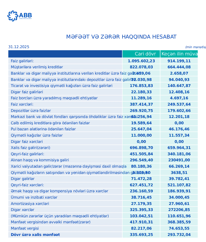 ABB (Azərbaycan Beynəlxalq Bankı) 2025-ci ildə maliyyə nəticələrini əhəmiyyətli dərəcədə - yalnız kəmiyyət baxımından deyil, struktur baxımından da - yaxşılaşdırıb.