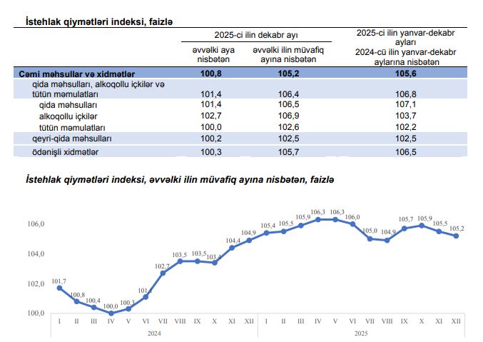 2025-ci ilin dekabr ayında istehlak qiymətləri indeksi əvvəlki aya nisbətən 0,8 faiz, yanvar-dekabr aylarında isə əvvəlki ilin müvafiq dövrünə nisbətən 5,6 faiz artıb.