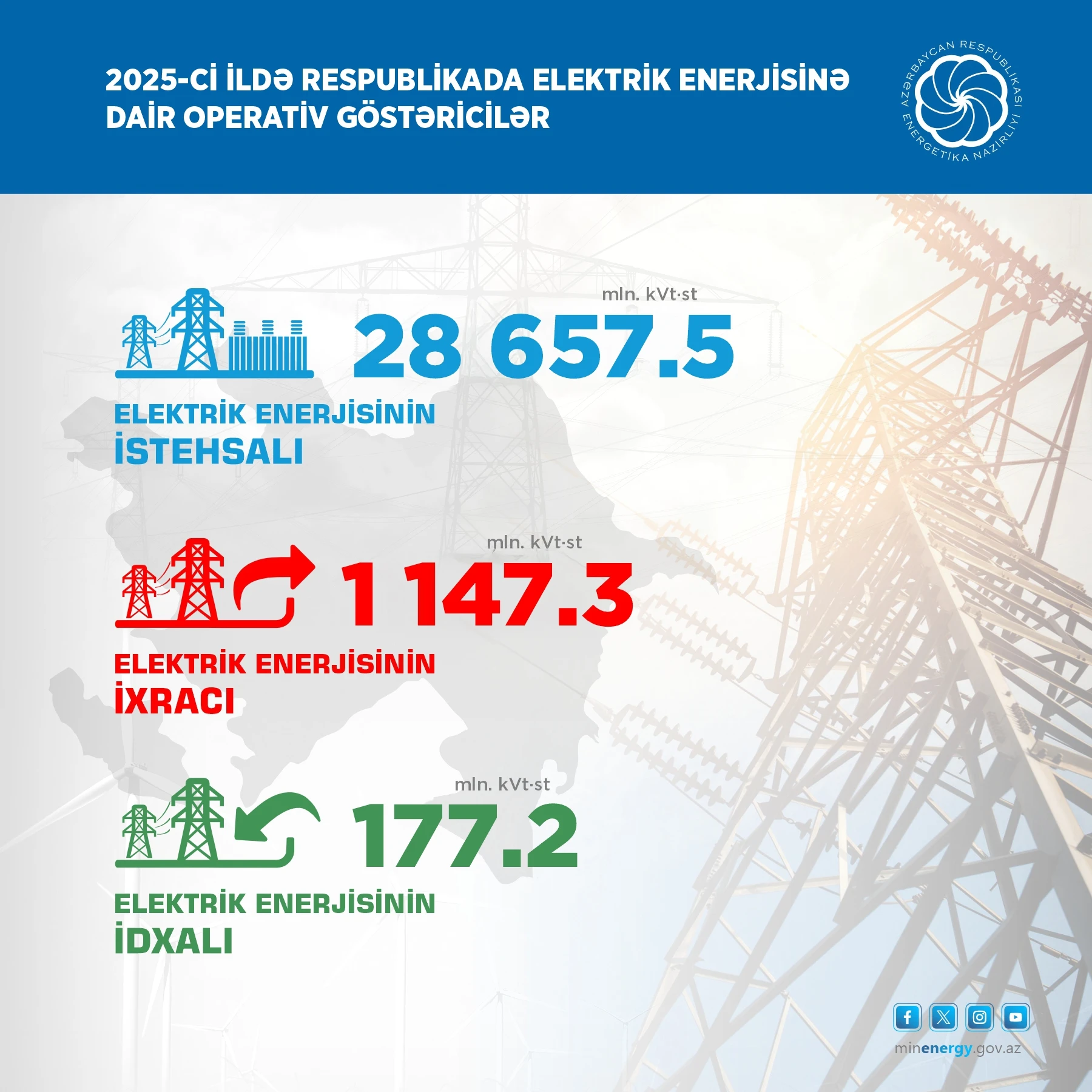 Hesabat dövründə elektrik enerjisinin ixracı 1 147,3 mln. kVt·st, idxalı isə 177,2 mln. kVt·st olub.